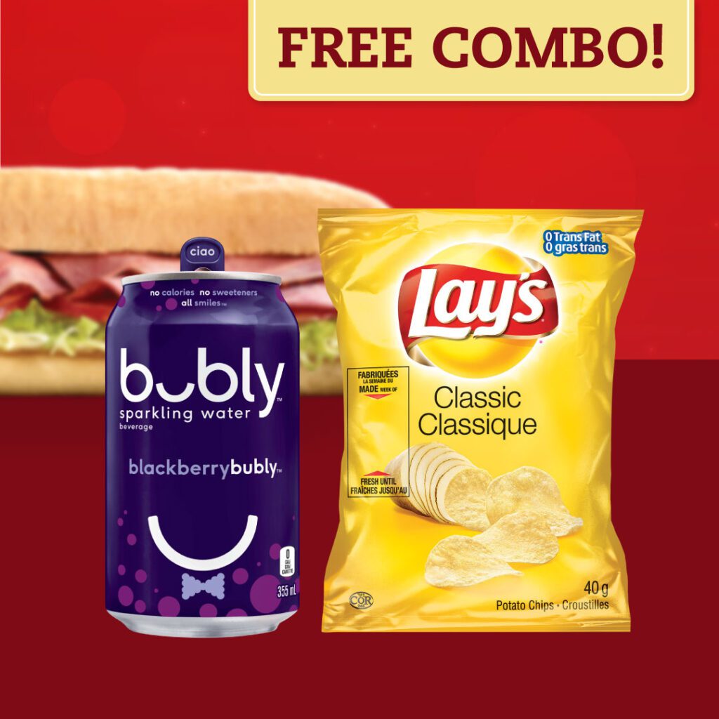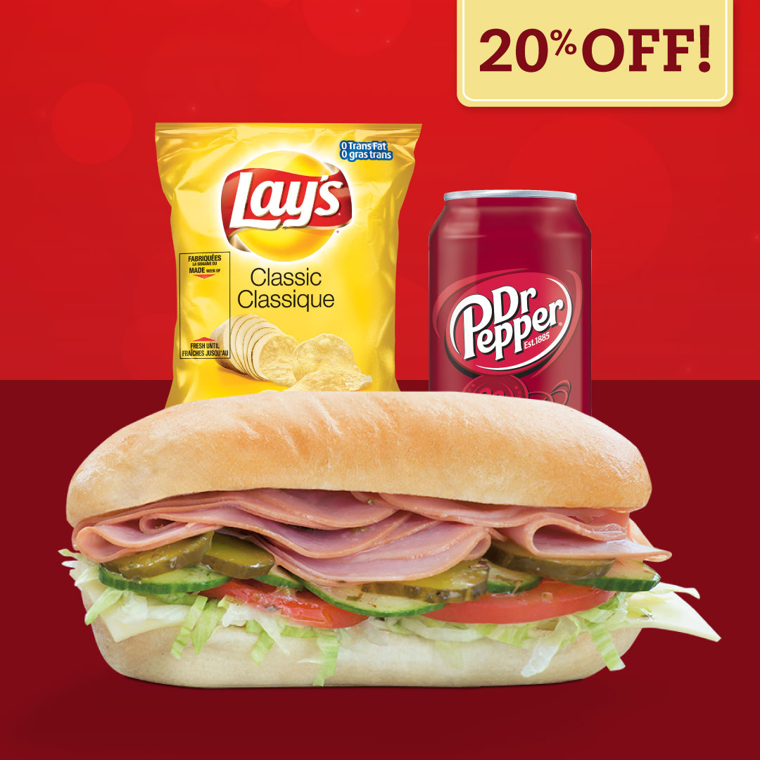 Get any Small Classics sub, 355ml canned drink, and choice of side – 2 cookies, bag of chips or deli dill pickles. Conditions may apply.
