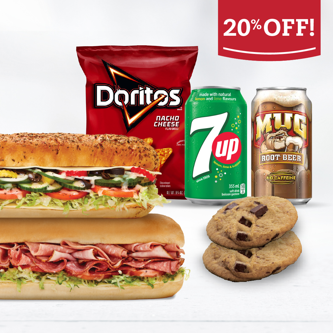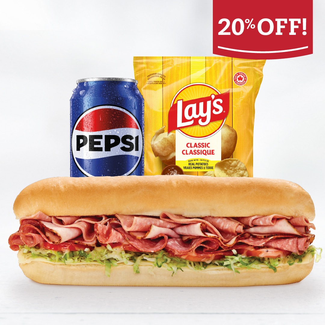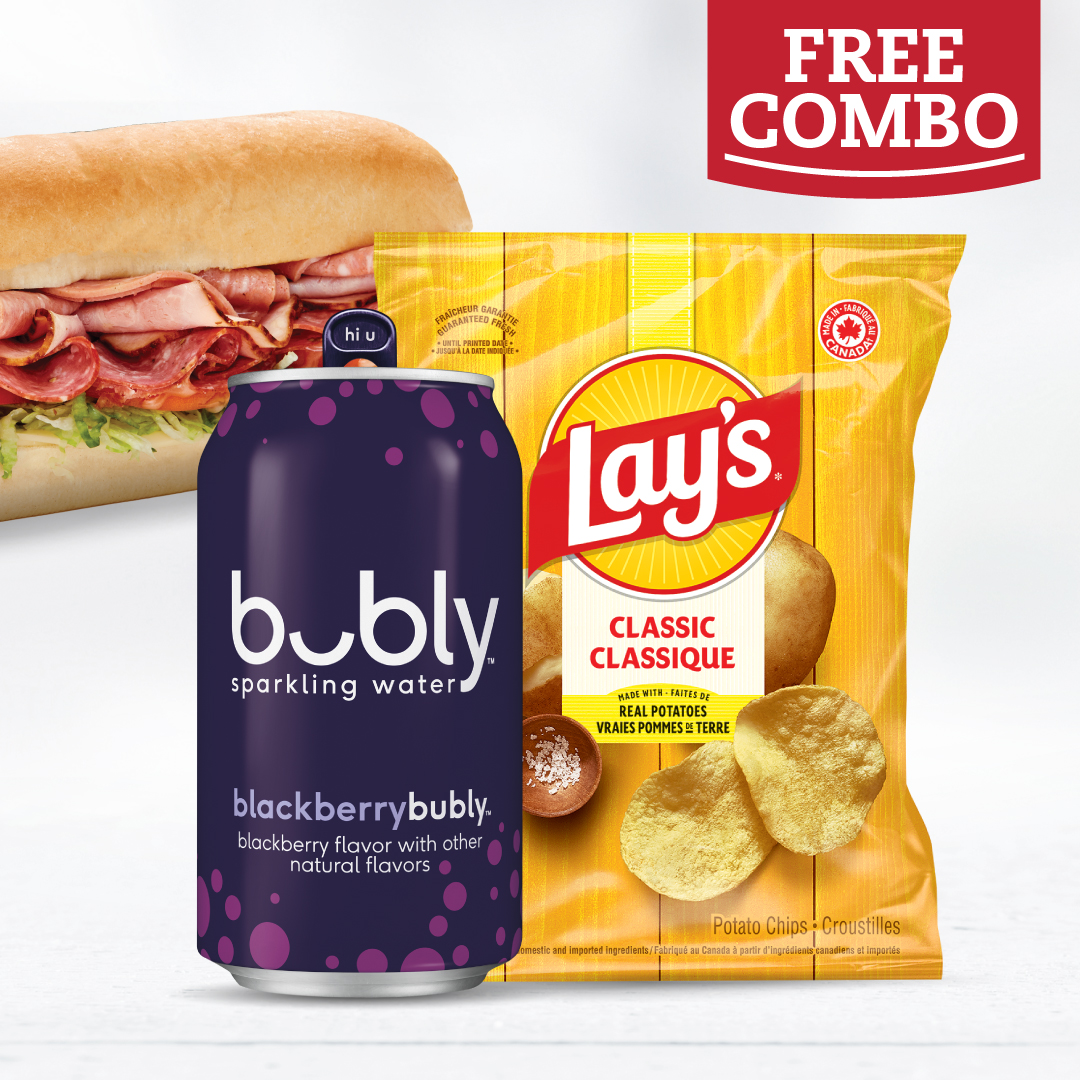 Participating subs: Assorted, Ham, Pizza, Italian Salami, Meatball, or Veggie & Cheese, 355ml canned drink, and choice of side – 2 cookies, bag of chips, or deli dill pickle.