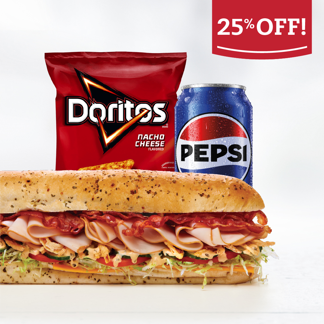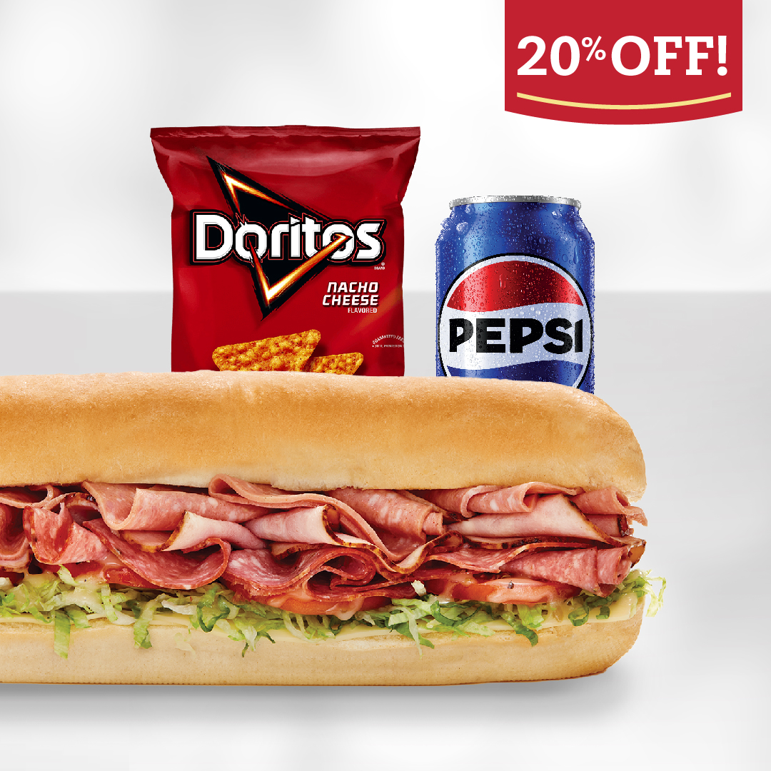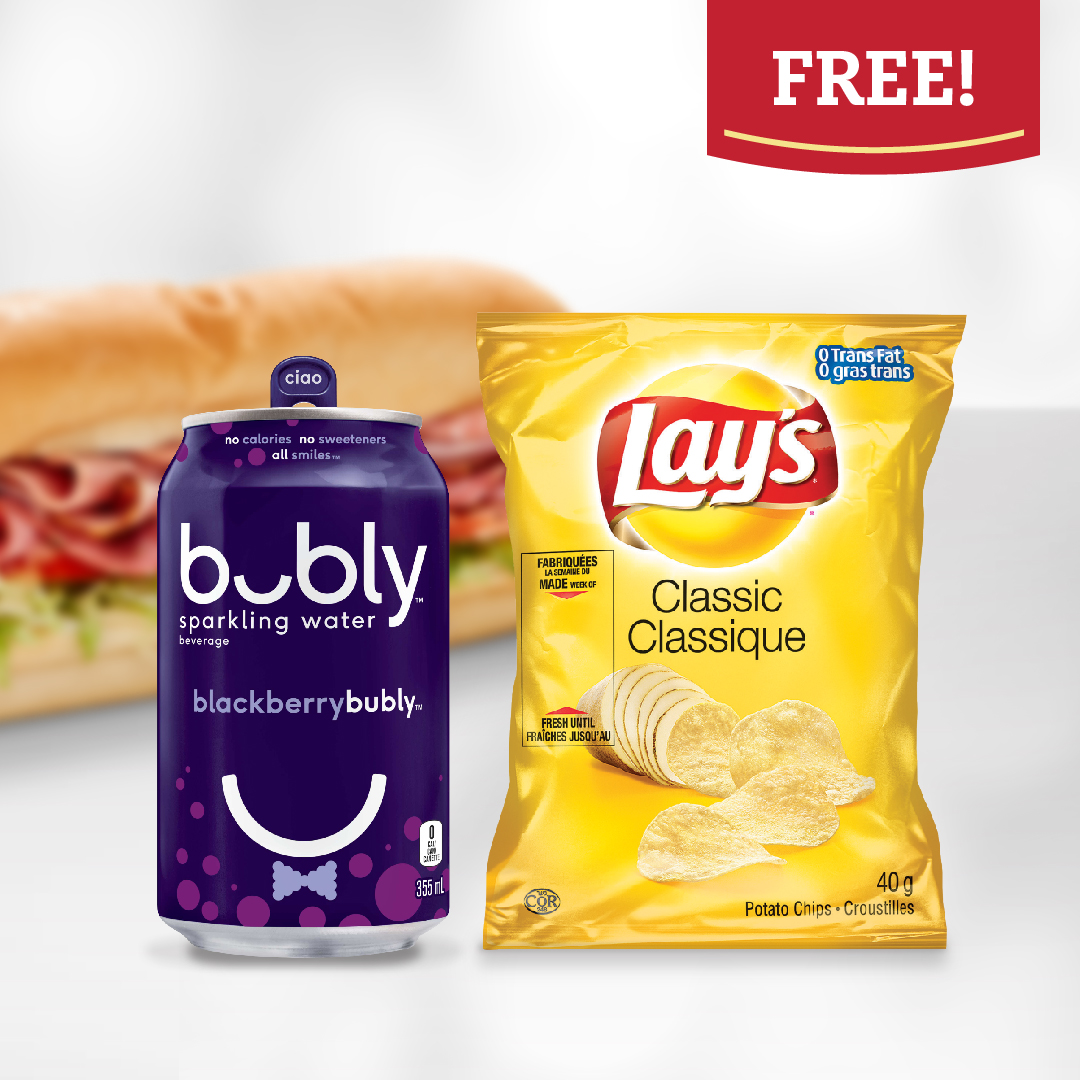 Participating subs: Assorted, Ham, Pizza, Italian Salami, Meatball, or Veggie & Cheese, 355ml canned drink, and choice of side – 2 cookies, bag of chips, or deli dill pickle.