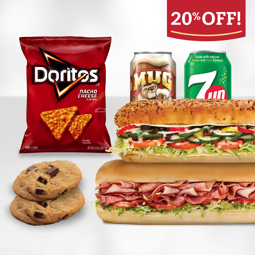 Includes (2) Large Subs, (2) Sides, and (2) 355ml canned of drinks. Participating subs: Assorted, Ham, Veg & Cheese, Pizza, Meatball, Italian Salami