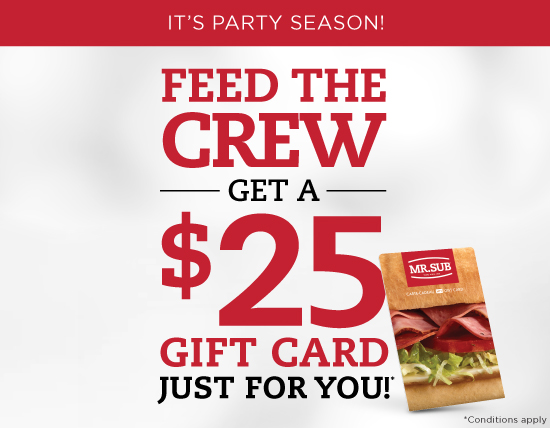 From October 13 – December 15, Spend $100 on catering and receive a $25 MR.SUB gift card!