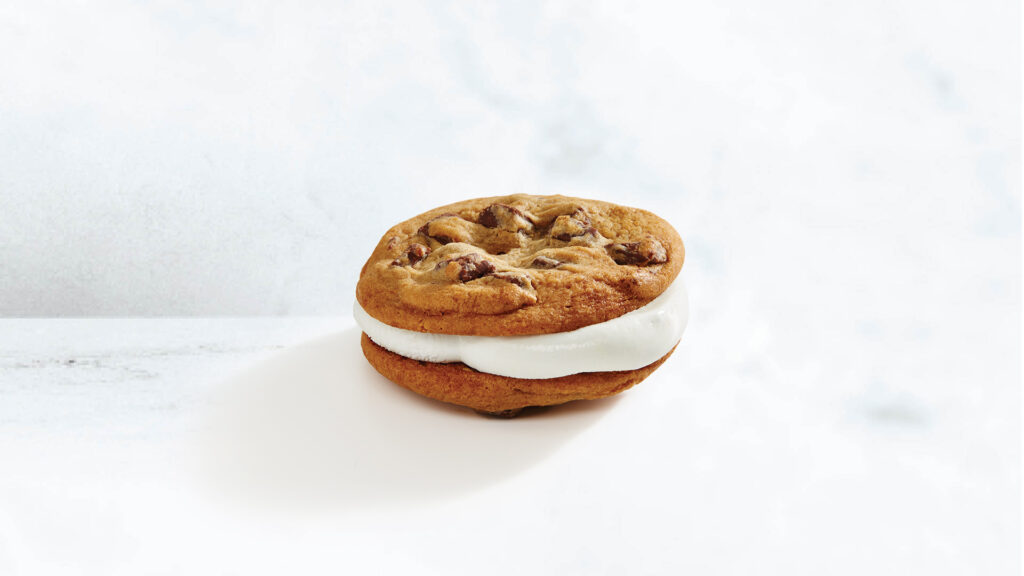 A Fire-Up of two chocolate chip cookies sandwiching toasty marshmallows. A warm, soft, gooey, sweet creation. Irresistible!