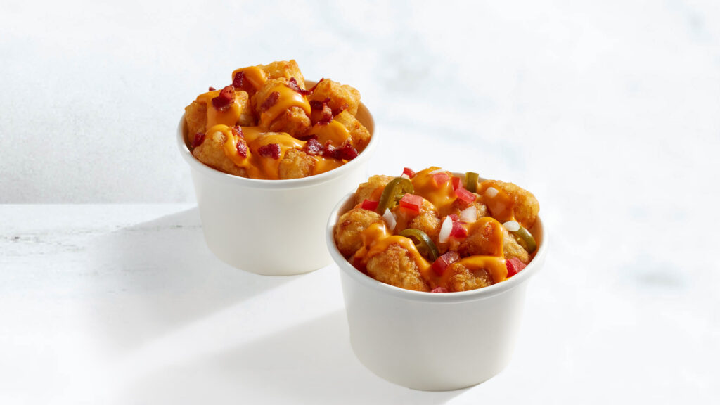 Golden potato tots layered with queso and available in two flavours you’ll melt over: